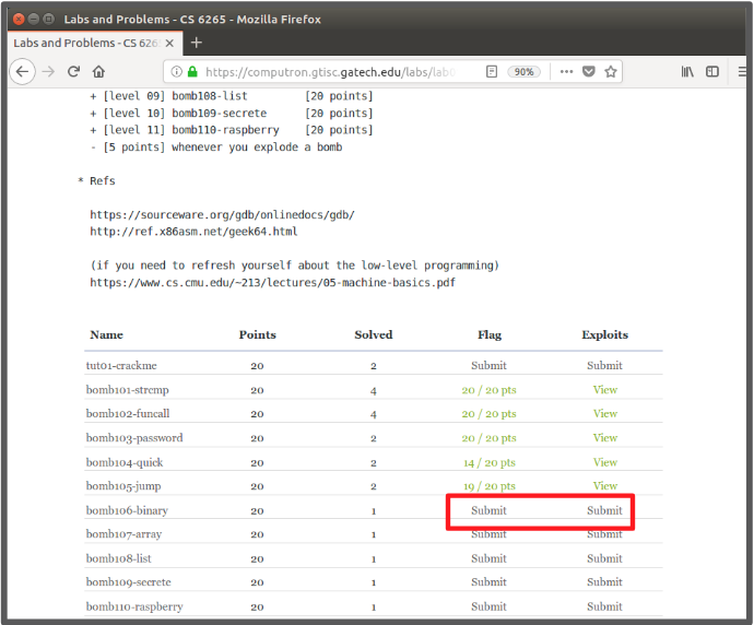 In each lab, you are asked to solve a set of challenges (typically 10 challenges, except for the first two weeks). For each challenge, you have to submit three things to the submission site: the flag you captured from the challenge, the exploit that you wrote to get the flag, and a write-up that summarizes how you formulated the exploit (see below).